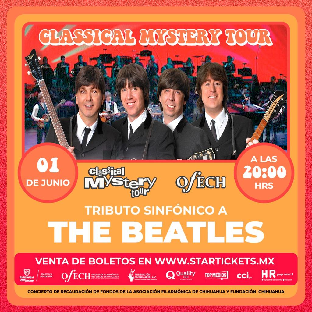 La Asociación Filarmónica de Chihuahua y la Fundación de Chihuahua A. C., presentan este próximo 1 de junio en ExpoChihuahua el concierto “Tributo Sinfónico a The Beatles” con Classical Mystery Tour y la Orquesta Filarmónica del Estado de Chihuahua (Ofech).