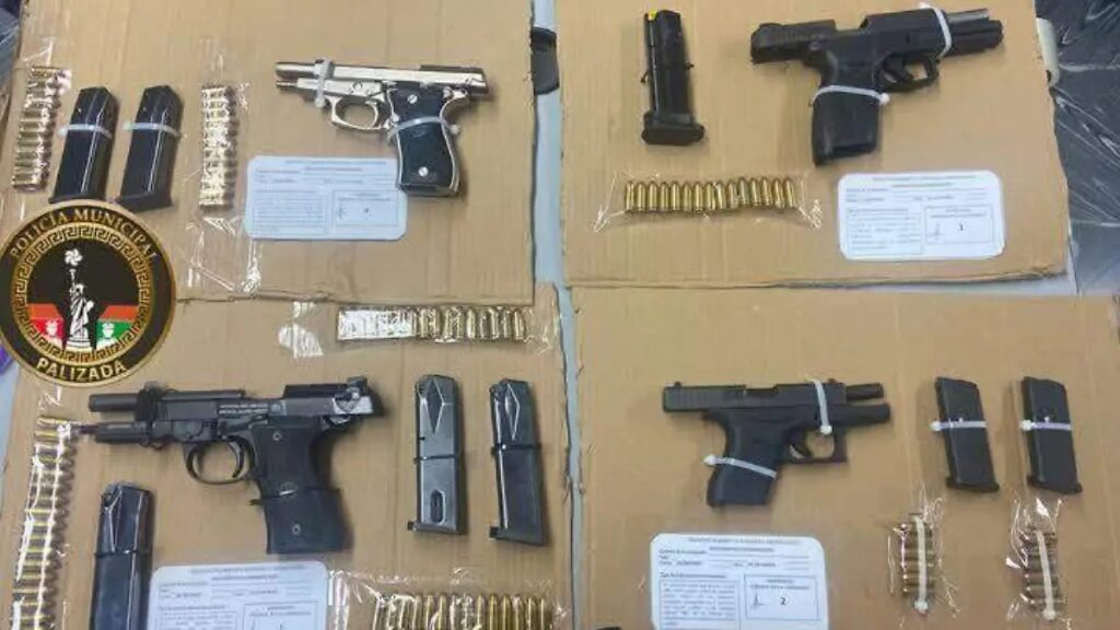 Durante la revisión del vehículo, los agentes localizaron armas de fuego, cargadores y cartuchos útiles. Algunos reportes señalan que fueron tres pistolas y decenas de cartuchos, mientras que otros hablan de hasta seis armas de fuego aseguradas. Uno de los acompañantes presentó un permiso de portación, pero los demás no pudieron acreditar autorización legal.