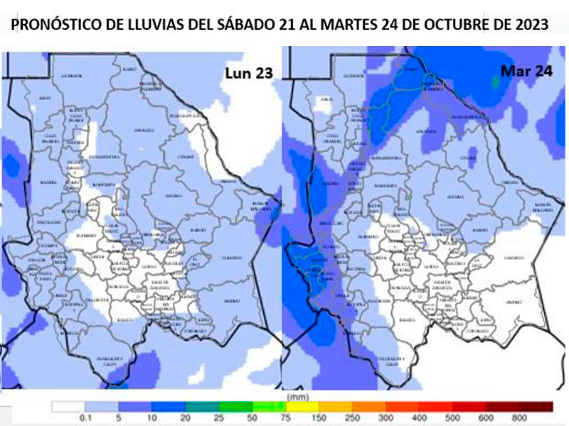 En cuanto al domingo 22 de octubre, se esperan lluvias de fuertes a puntualmente muy fuertes (de 50.1 a 75 mm) en parte de la zona suroeste, incluye Guadalupe y Calvo; así como moderadas a puntualmente fuertes (de 25.1 a 50 mm) en las zonas suroeste y sur, las mismas pueden estar acompañadas de actividad eléctrica y posible caída de granizo.