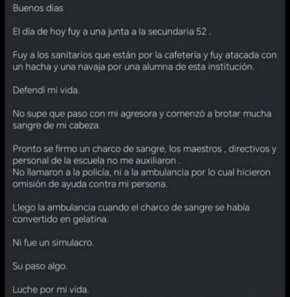Lo anterior ocurrió en los baños de la escuela, según narró la víctima a través de un testimonio que circula en las redes sociales, cuando asistió a una reunión de padres la mañana de este martes.