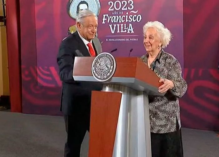 El presidente Andrés Manuel López Obrador recibió en la mañanera a Estela de Carlotto, presidenta y fundadora de las Abuelas de Plaza de Mayo de Argentina, organización que ha ayudado a localizar a personas desaparecidas durante la dictadura militar de ese país.
