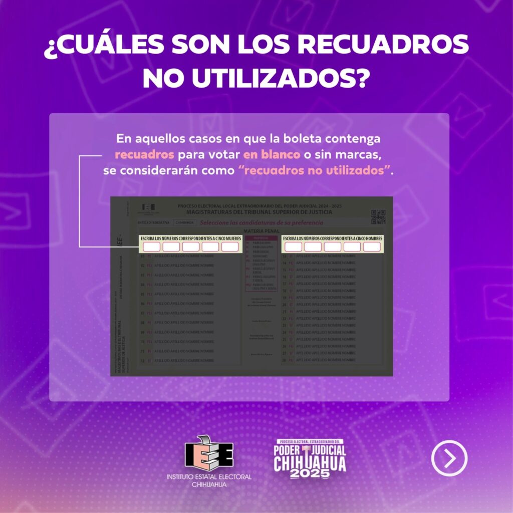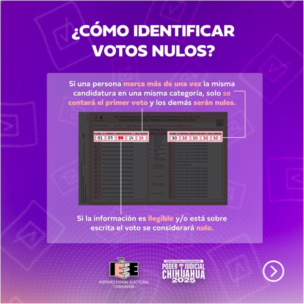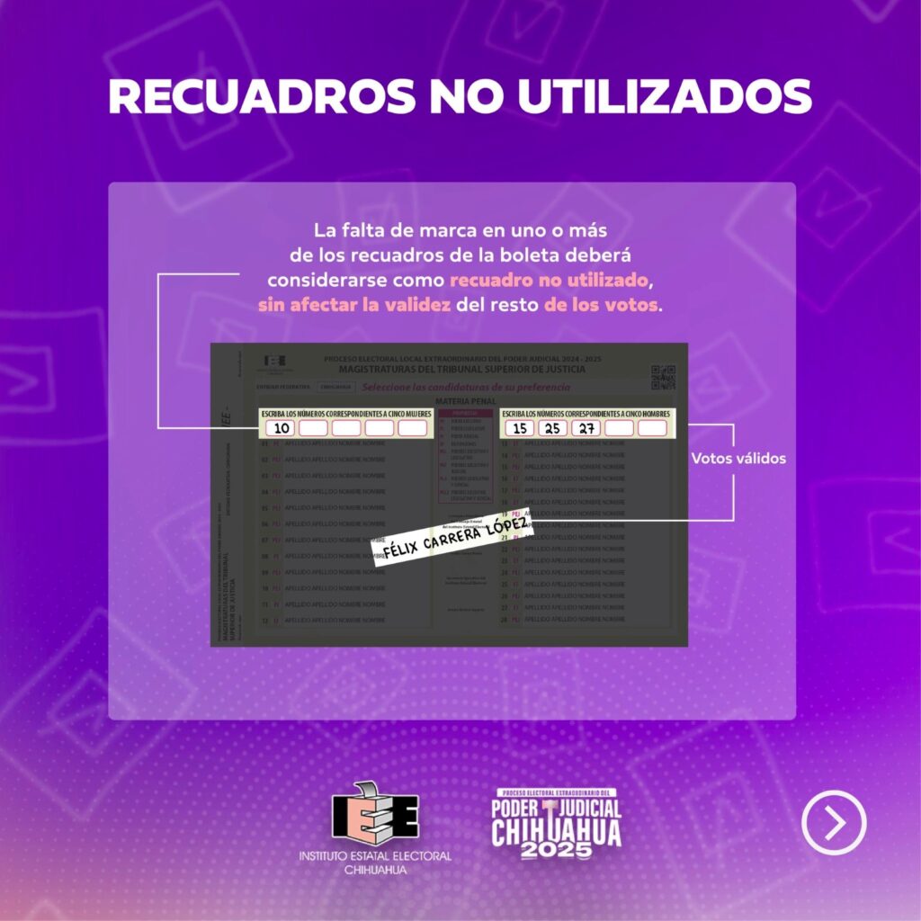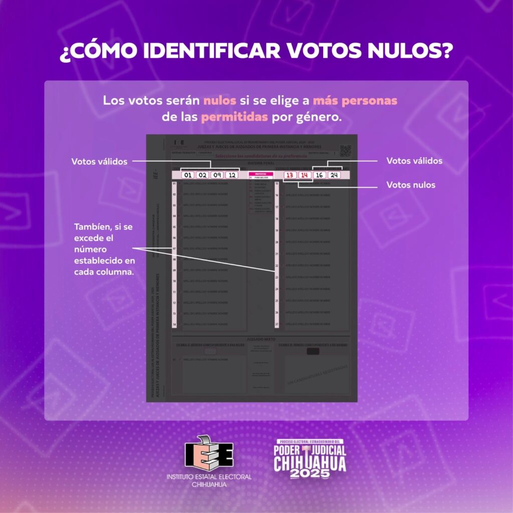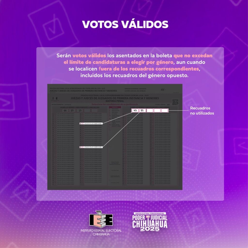 De igual manera, se informó que se considerará como voto válido “aquellos asentados en una boleta que no excedan el límite de candidaturas a elegir por género, aun cuando se localicen fuera de los recuadros correspondientes”.