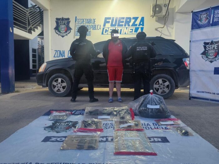 La Policía de Despliegue de la Secretaría de Seguridad Pública del Estado (SSPE) llevó a cabo el arresto de un sujeto en el municipio de Ojinaga, identificado como Eduardo Arath L. L., a quien se le aseguraron armas de fuego, equipo táctico y presunta droga.