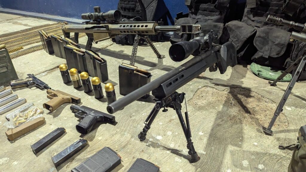 Durante la inspección de los vehículos, se aseguraron diversas armas de fuego, entre ellas un fusil Barrett calibre .50, tres pistolas, tres fusiles de asalto y una ametralladora, además de 34 cargadores y más de 2 mil 500 cartuchos útiles de distintos calibres, añade el reporte.