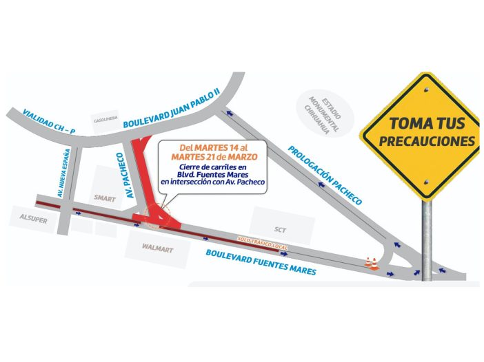 A partir de este martes 14 y hasta el 21 de marzo, el bulevar José Fuentes Mares quedará cerrado a la circulación en los carriles de sur a norte, a la altura de la avenida Pacheco, frente al supermercado Walmart.