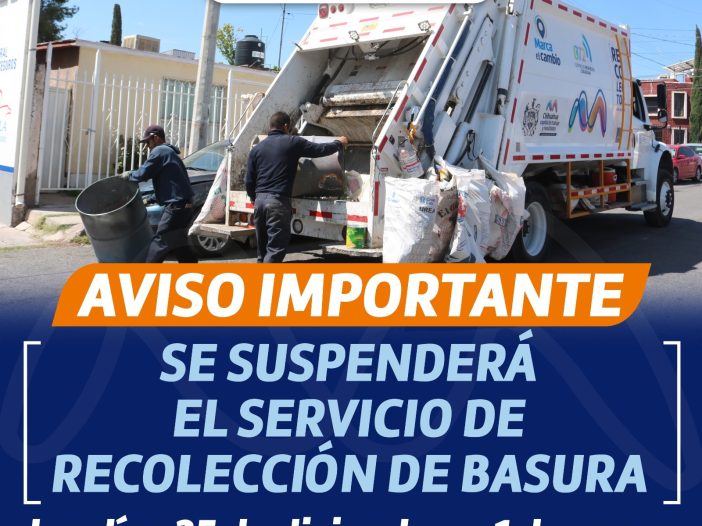 Con motivo de la celebración de las fiestas decembrinas, el Gobierno Municipal, a través de la Dirección de Servicios Públicos Municipales, informa a la ciudadanía en general que los días 25 de diciembre y 1 de enero, se suspenderá el servicio de recolección de basura.