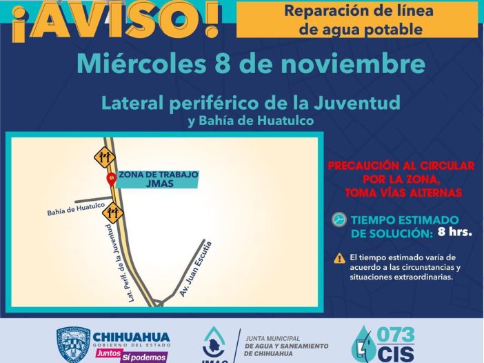La JMAS Chihuahua reparará línea de agua potable en Periférico de la Juventud y calle Bahía de Huatulco este miércoles 8 de noviembre de 8 de la mañana a 4 de la tarde, informó la dependencia en un comunicado de prensa.