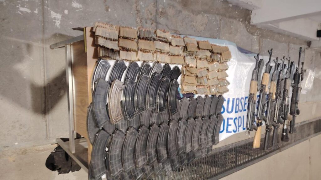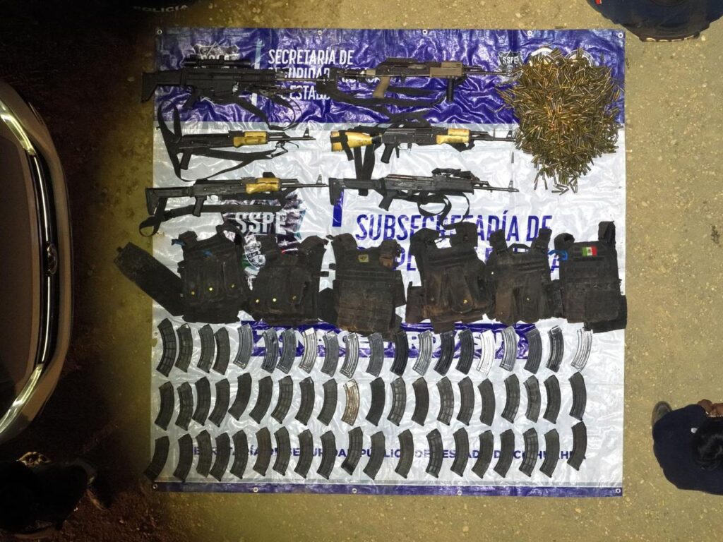 Al realizar la inspección, los oficiales aseguraron 6 armas de fuego largas, mil 770 cartuchos útiles, 60 cargadores y 6 chalecos tácticos.