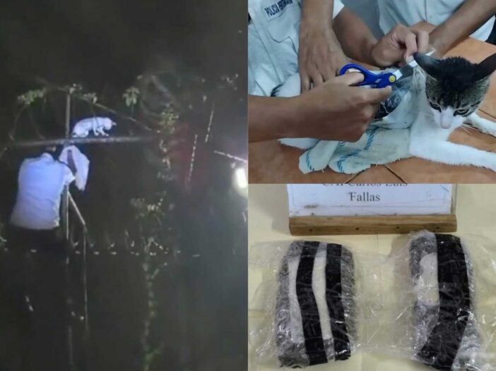 Al lograr bajarlo, los guardias se dieron cuenta que el gato transportaba 265 gramos de marihuana y 67 gramos de metanfetamina.