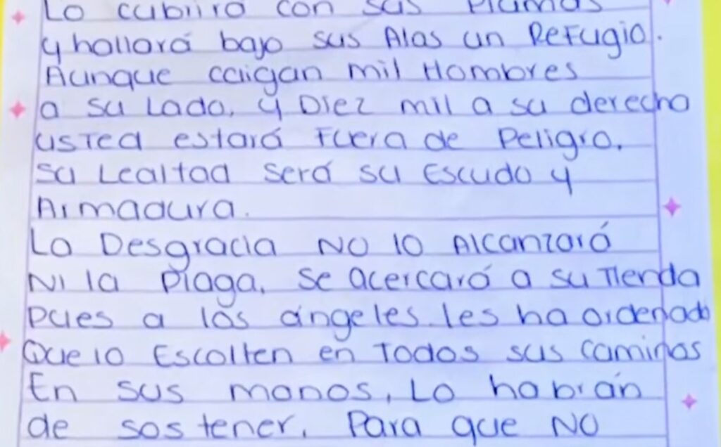 El texto corresponde al Salmo 91, uno de los fragmentos más conocidos del Antiguo Testamento, tradicionalmente asociado con la protección divina frente al peligro. La frase que encabezaba el altar —“Caerán a tu lado mil, y diez mil a tu diestra; mas a ti no llegará”— es utilizada con frecuencia como oración de resguardo en contextos de amenaza, persecución o guerra.