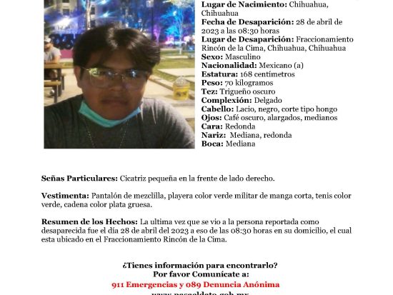 El jóven de 19 años desapareció el pasado 28 de abril en la ciudad de Chihuahua