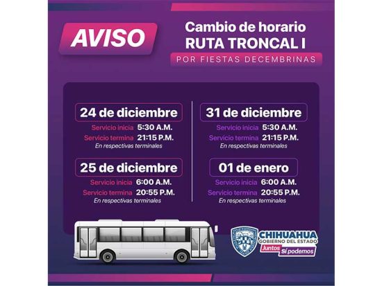 Anuncian cambios en horarios de ruta troncal 1 por fiestas decembrinas