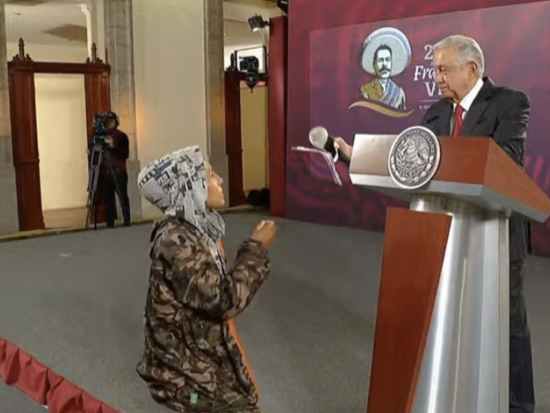 e entregó unos documentos y un “pejeluche” al mandatario federal y se hincó brevemente