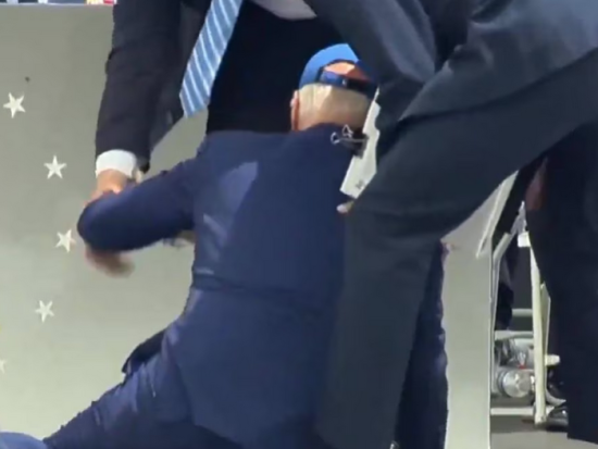 Tras la caída, Biden se puso de rodillas rápidamente, auxiliado por tres personas, y regresó a su asiento