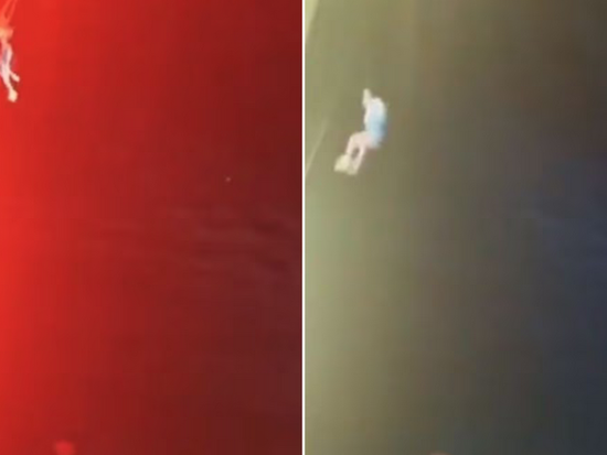 La mujer y su esposo se elevaron con ayuda de una grúa, pero segundos después se ve a la mujer fallar un movimiento y caer al suelo