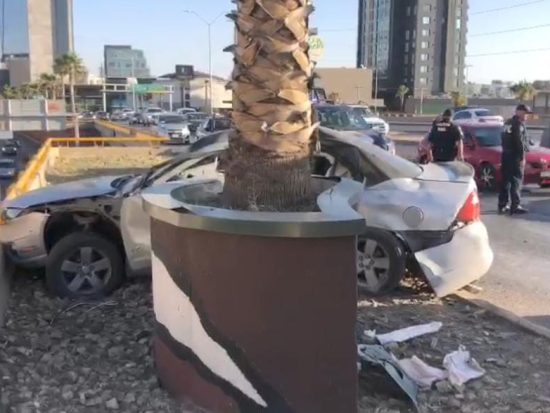 Conductor pierde el control y se impacta contra la base de una jardinera ubicada sobre el camellón