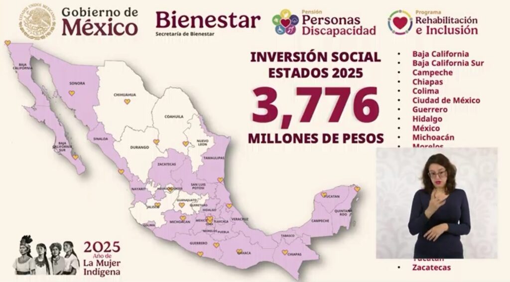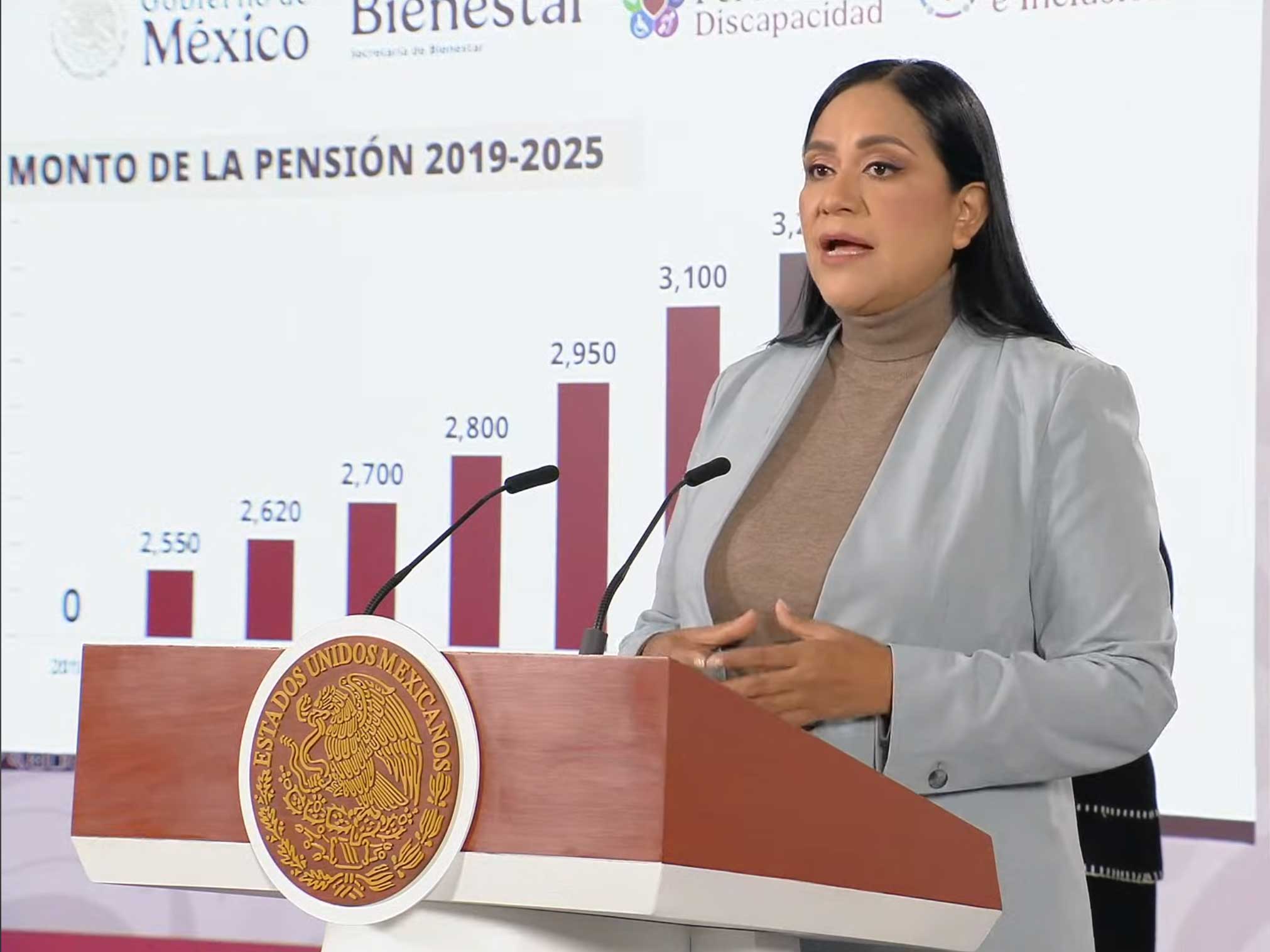 La titular del Bienestar informó que un millón 614 mil 018 personas con discapacidad menores de 65 años reciben actualmente la pensión, con una inversión anual de 32 mil millones de pesos.