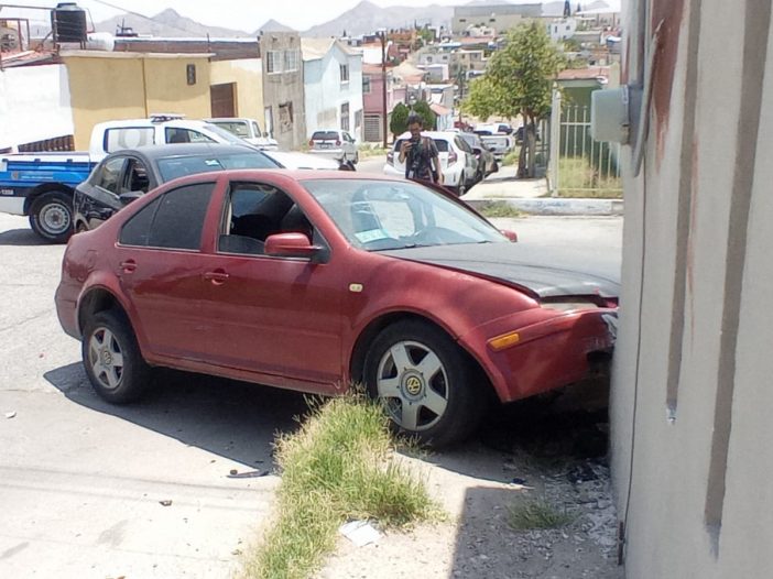 Conductora de un vehículo Nissan Sentra de color negro se impactó contra un vehículo Jetta el cual se proyectó contra la cochera de un domicilio en la colonia Diego Lucero.