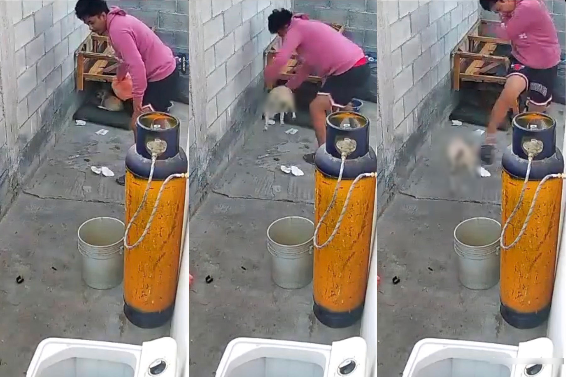 En las imágenes con fecha del 22 de febrero, se observa al sujeto sacar al animal de una casita en el patio, patearlo repetidamente y aventarlo por el pasillo, mientras la perrita intenta refugiarse para evitar más golpes.