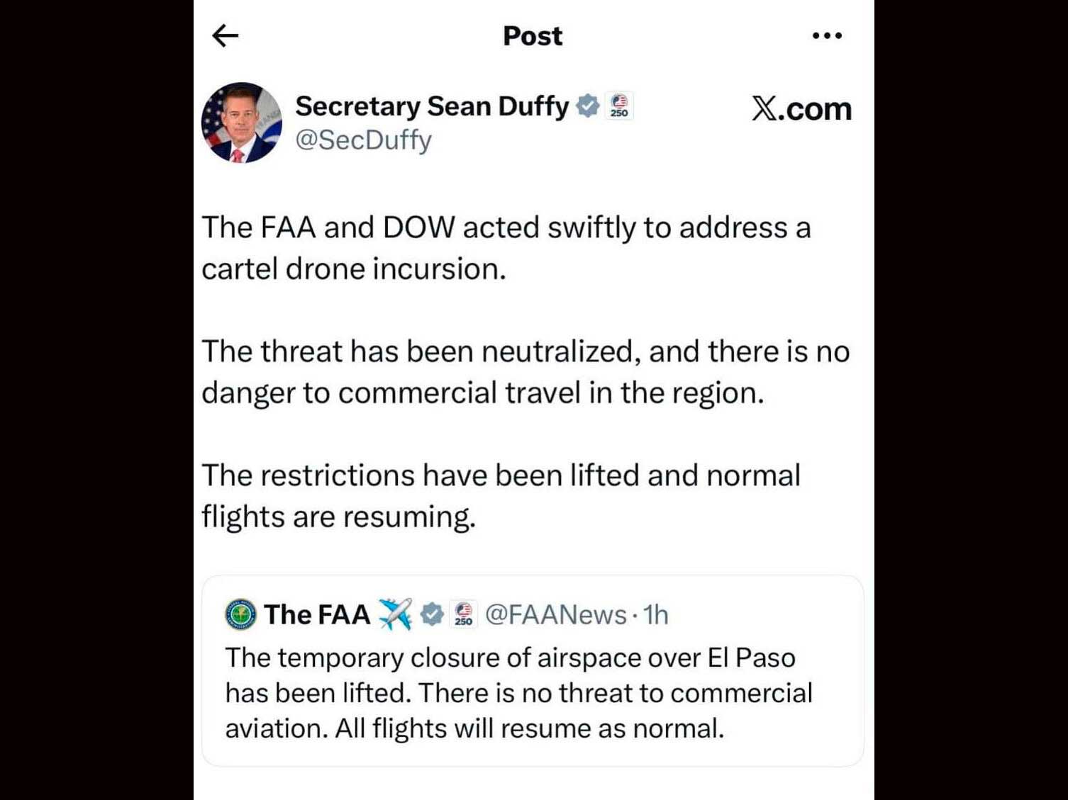 Posteriormente, la FAA confirmó que el cierre temporal del espacio aéreo fue levantado, al descartar cualquier riesgo para la aviación civil, y precisó que todas las operaciones aéreas se reanudaron con normalidad en el Aeropuerto Internacional de El Paso.
