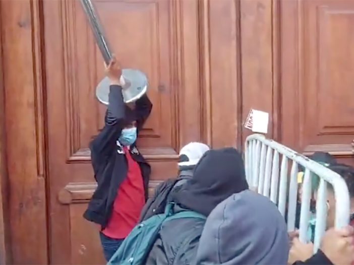 Un grupo de jóvenes encapuchados acompañando a los padres y madres de los 43 estudiantes desaparecidos de Ayotzinapa, dieron un portazo en uno de los accesos de Palacio Nacional, sobre la calle Moneda, informaron medios nacionales.