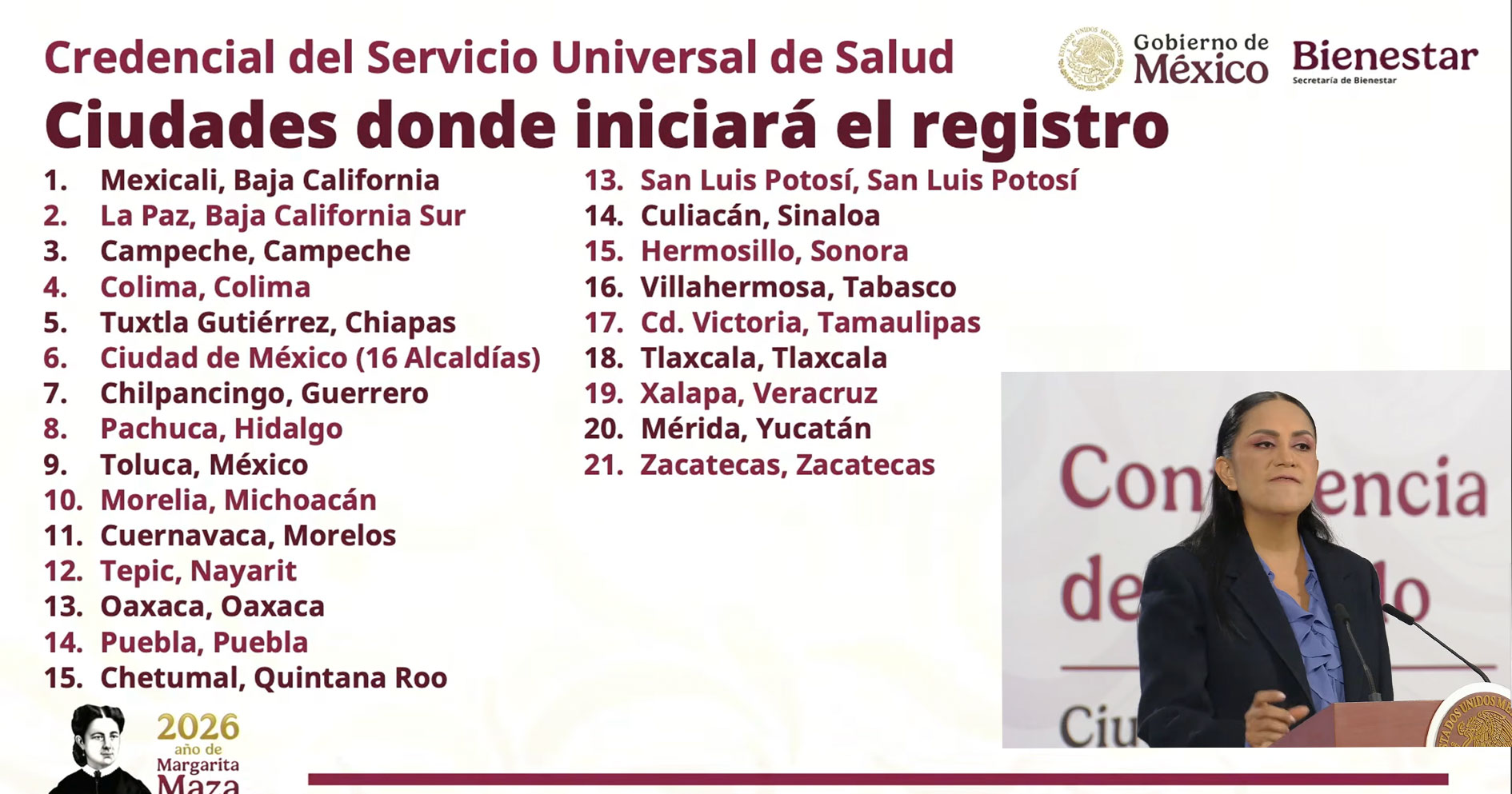 La secretaria del Bienestar, Ariadna Montiel Reyes, informó que a partir de abril comenzará el proceso de credencialización del Seguro Universal de Salud, para lo cual —dijo— se instalarán centros de afiliación en todas las capitales del país.