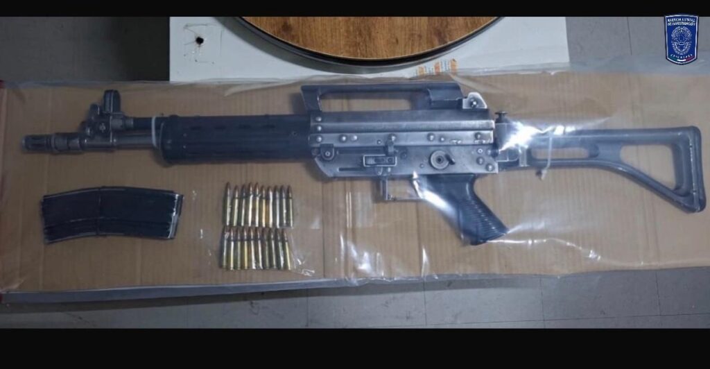 Sin embargo, el hoy detenido portaba un arma larga con la leyenda Beretta, calibre 5.56 X 45 y cuatro cargadores para esa arma, abastecidos con 100 cartuchos útiles.