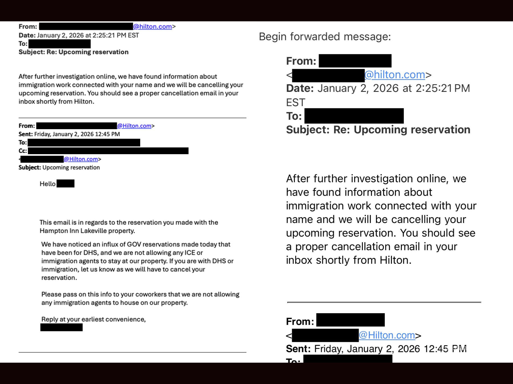 Correos electrónicos citados en reportes confirman que gerentes de propiedades Hilton justificaron las cancelaciones tras “investigaciones en línea” que vinculaban las reservas con trabajo de inmigración.
