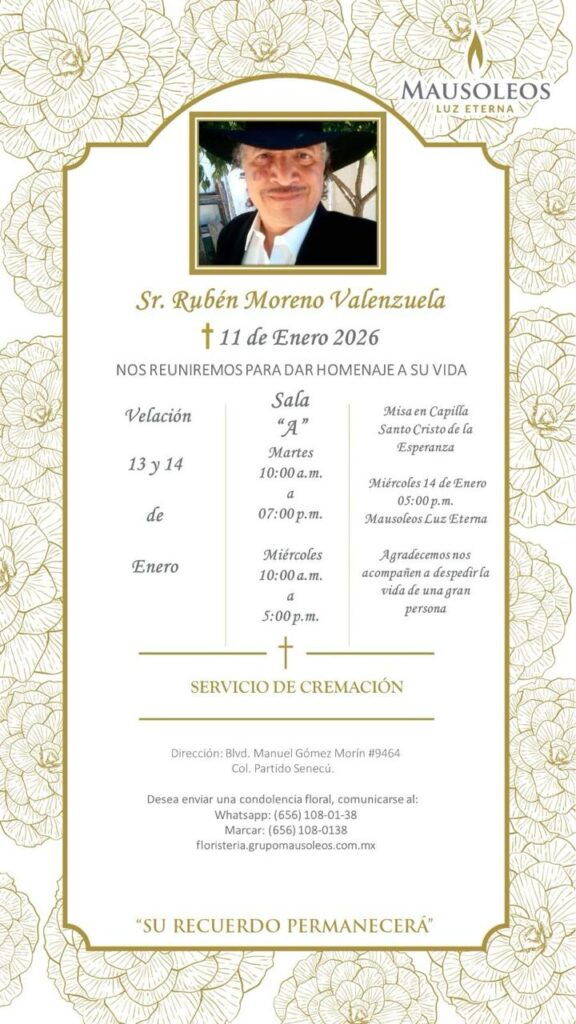 La familia de Rubén Moreno Valenzuela dará a conocer en las próximas horas los detalles sobre sus honras fúnebres. Esta información se actualizará conforme se confirmen horarios y lugares.