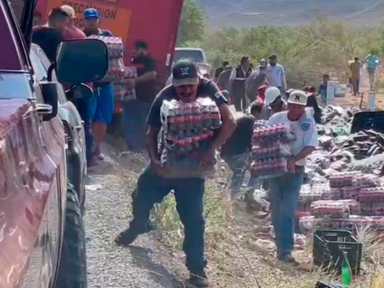 Vuelca tráiler cargado de Coca-Cola; ciudadanos llenan las cajas de sus camionetas
