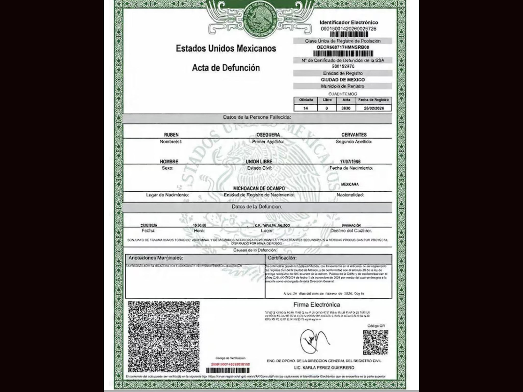 El documento establece que el fallecimiento ocurrió el 22 de febrero de 2026, a las 10:30 horas, en Tapalpa, Jalisco. El registro quedó asentado en la oficialía 14, libro 0, acta 3830, con fecha de inscripción del 28 de febrero de 2026.