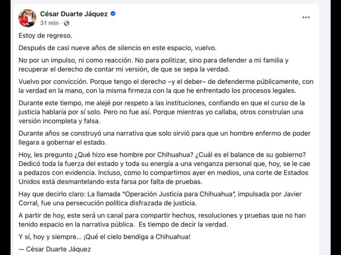“El cielo bendiga a Chihuahua”, concluye Duarte en su mensaje, dejando claro que su regreso a la vida pública será también una estrategia de defensa mediática paralela a sus procesos judiciales.