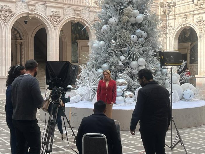 La gobernadora Maru Campos Galván grabó esta tarde el video de invitación a la comunidad chihuahuense, del encendido tradicional del árbol de Navidad de esta temporada.