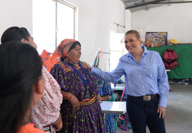 Durante su visita, Campos recorrió el taller de costura del asentamiento, operado por las mujeres locales, donde se producen prendas tradicionales que generan ingresos para las familias del lugar. La gobernadora estuvo acompañada por la presidenta del DIF Estatal, María Eugenia Galván Antillón, y el secretario de Pueblos y Comunidades Indígenas, Enrique Rascón.