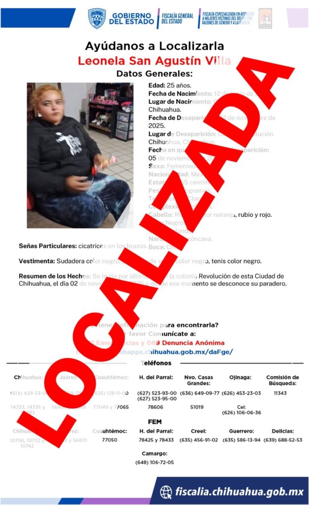De manera inmediata se activaron las acciones de búsqueda que llevaron a localizarla en Ciudad Juárez, declarando ante el Ministerio Público de la FEM, que su ausencia fue voluntaria y que no fue víctima de algún delito.