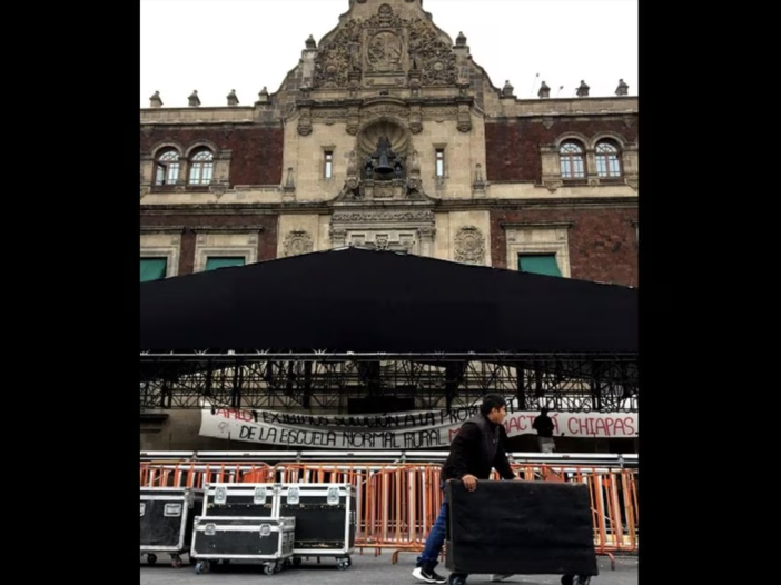 El templete se instala exactamente abajo del balcón presidencial de Palacio Nacional, y en donde una poco más de una docena de trabajadores, con el apoyo de un montacargas, laboran para colocar la pesada estructura.