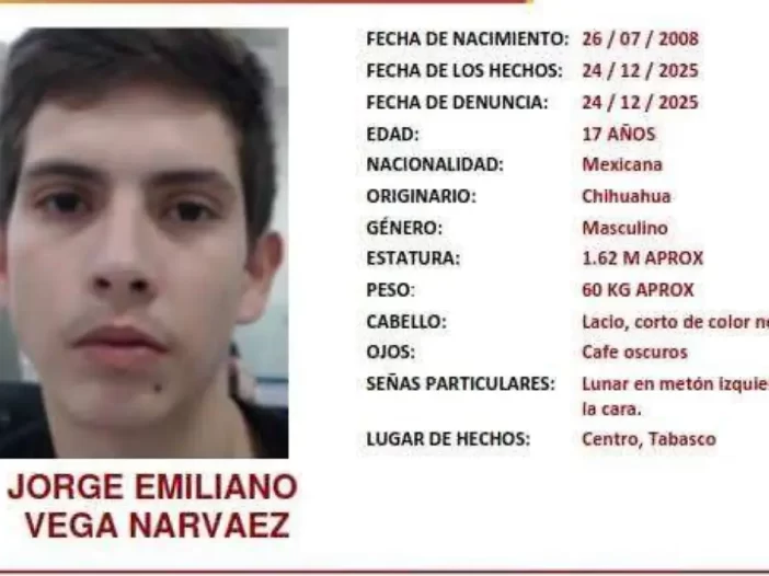 Jorge Emiliano Vega tiene 17 años y es originario de Chihuahua. Su nombre apareció en fichas de búsqueda y alertas oficiales luego de que, el 24 de diciembre, se le perdiera el rastro en Tabasco, durante un traslado bajo custodia del Instituto Nacional de Migración (INM).