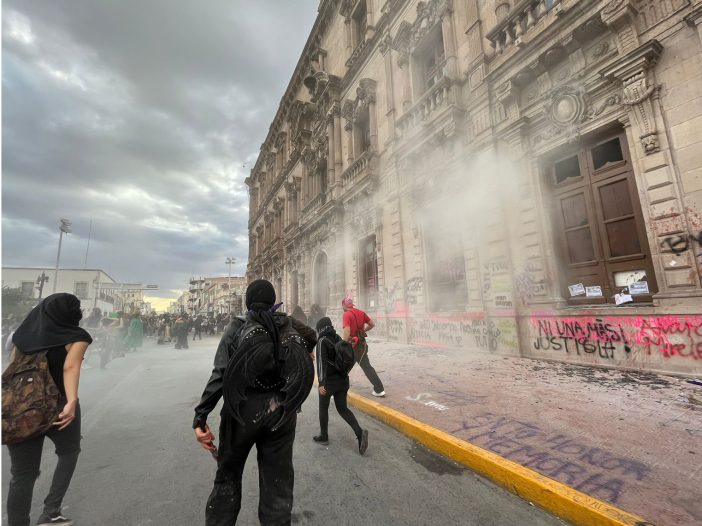 “Cuando llegamos había varias chicas del bloque negro intentando romper la puerta de palacio y quebrando vidrios, nos estaban echando primero el gas de los extintores y después ya fue lacrimógeno”, dijo una de las encargadas de seguridad dentro de la Colectiva Malinche.