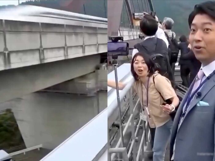 En un video que circula en redes sociales, puede observarse el momento en el que el tren pasa y deja estupefacto al periodista, quien con la boca abierta, dice más que mil palabras.