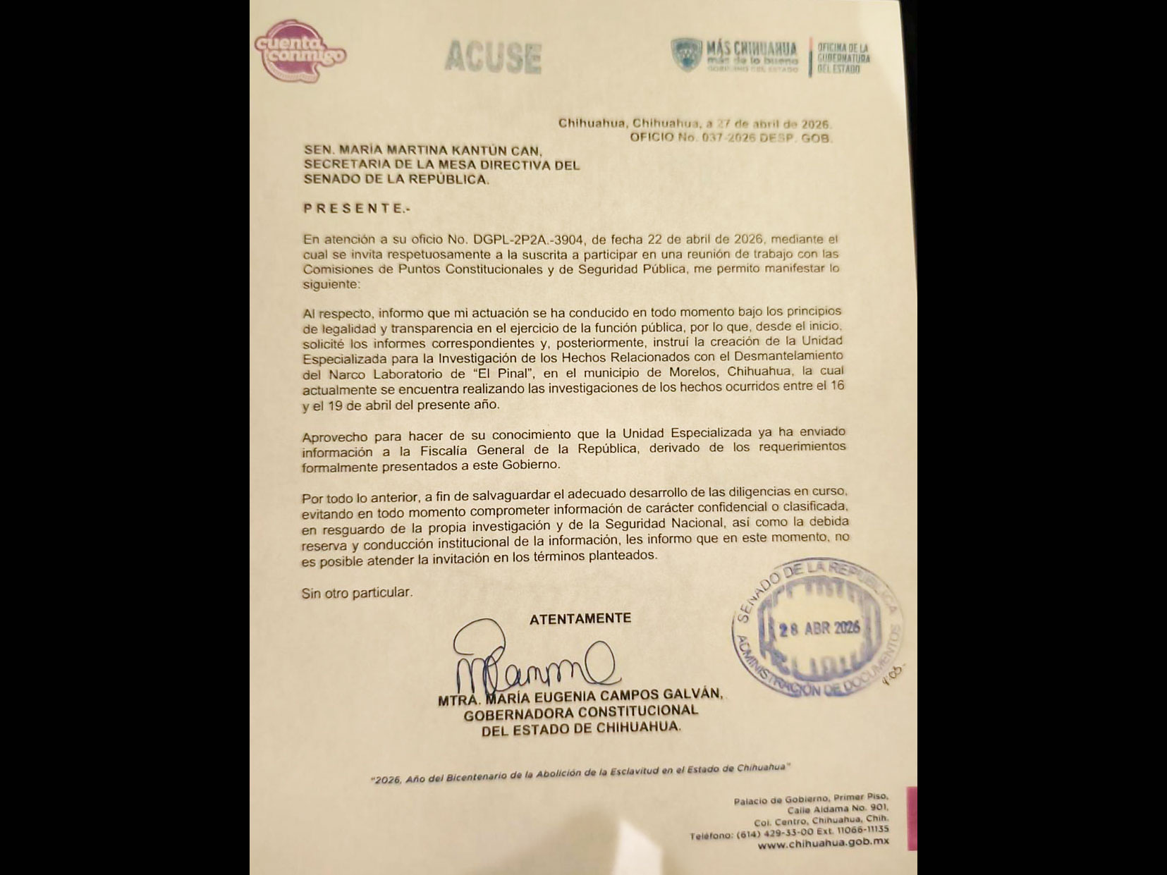 La gobernadora María Eugenia Campos Galván declinó participar en la reunión de trabajo convocada por el Senado de la República para abordar el caso de la presunta participación de agentes extranjeros en Chihuahua.