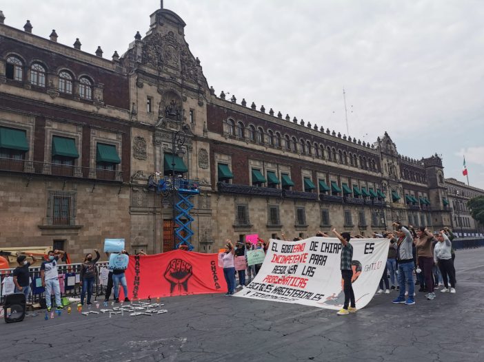 Esta tarde, un grupo de estudiantes de la Normal Rural Mactumactzá, Chiapas, brincó las vallas metálicas que protegen Palacio Nacional y colocaron una manta abajo del Balcón Presidencial exigiendo al presidente López Obrador atender sus demandas, entre ellas, cancelar carpetas de investigación en contra de 95 estudiantes de esa escuela.