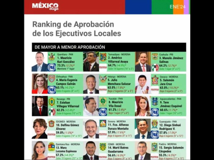De acuerdo con la información publicada por la casa encuestadora, Maru Campos subió cuatro posiciones en el ranking apenas iniciado el 2024, pasando del 8º al 4º sitio, ubicándose así en el Top 5 de los mandatarios estatales con mayor aprobación.