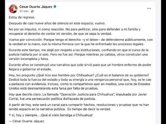 El exgobernador de Chihuahua, César Duarte Jáquez, se presentó ante los medios de comunicación de la capital del estado para sostener lo que su equipo de defensa expuso previamente, que los retenes de agua del rancho El Saucito eran legales.