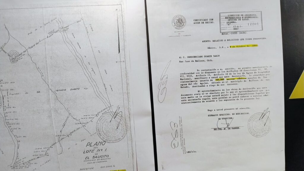“El dato de que había 700 mil metros cúbicos de agua lo sacaron del permiso que le dieron a mi padre”, afirmó Duarte Jáquez, al tiempo que mostraba una réplica del permiso otorgado por la autoridad federal de la época, amplificada y colgada de una pared.