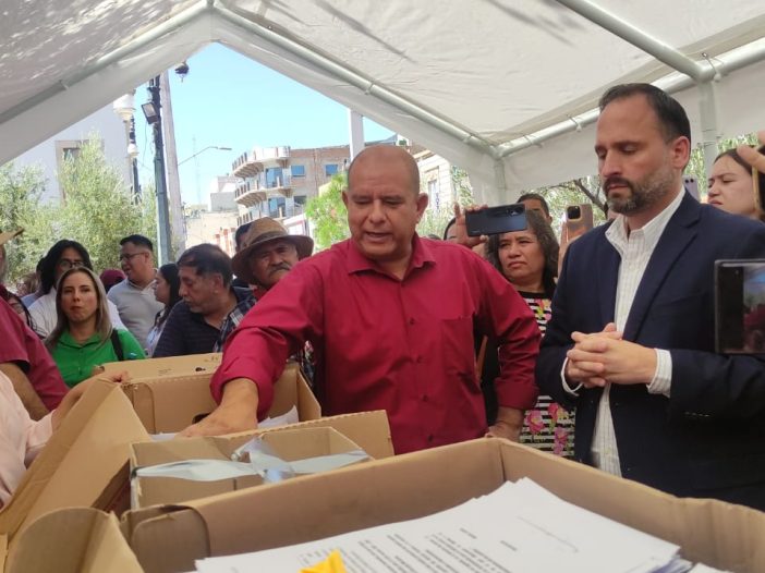 El secretario general de Gobierno, Santiago de la Peña, atendió la petición para recibir las 100 mil firmas de padres de familia que exigen la entrega de los libros de texto gratuitos a sus hijos e hijas.
