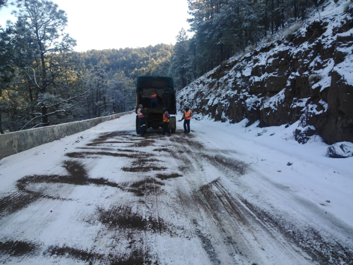 Informó que la intervención con retiro de nieve, y colocación de sal y arena, se hizo en los siguientes tramos: San Pedro – Creel; Guachochi, km 195+000 al 220+000; Balleza-Guachochi, km 131+600; Madera-Ejido El Largo, tramo km 28+000 al 52+000.