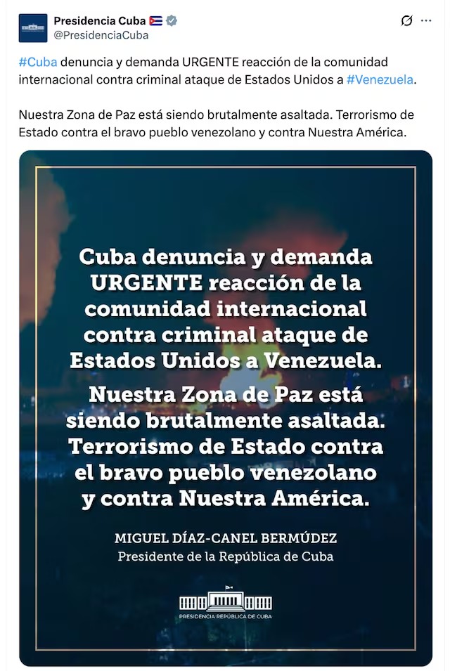 La Cuba expresó una condena enérgica y acusó a Estados Unidos de cometer una agresión militar contra Venezuela.