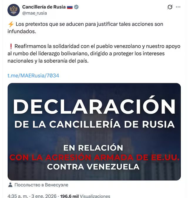 Moscú reiteró su respaldo político y diplomático a Venezuela y llamó a una reunión urgente de los mecanismos internacionales, incluida la ONU, para evaluar la legalidad de la intervención y sus consecuencias. También insistió en que el conflicto debe resolverse exclusivamente por la vía diplomática, sin amenazas ni uso de la fuerza.