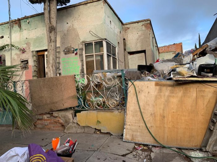 Cuando se camina por la acera contigua a la casa la escena es dantesca: un improvisado barandal de tablas rotas y cartón se encuentra por reventar y arrojar decenas de bolsas de basura pestilente a la calle.