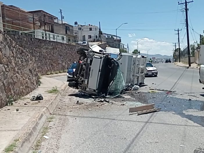 Un camión recolector de basura de la empresa Aseo Urbano se desbarrancó en la calle 53 para luego caer y volcar sobre la avenida 20 de Noviembre, en la colonia Cazadores.
